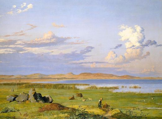 Johan Thomas Lundbye: ”Landskab ved Arresø med udsigt til Sandflugtsbakkerne ved Tisvilde.” 1838. Illustration fra bogen. [Lundbye blev på tragisk vis dræbt ved en vådeskudsulykke under den første Slesvigske krig – også kaldt Treårskrigen.]