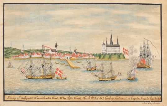 Billedet viser Helsingør Red, hvor skibene skulle erlægge Øresundstold til kongen. Den engelske fregat til højre i billedet er ikke i ildkamp mod Danmark. Der saluteres blot på nautisk vis, hvorefter batterierne på Kronborg svarer igen.