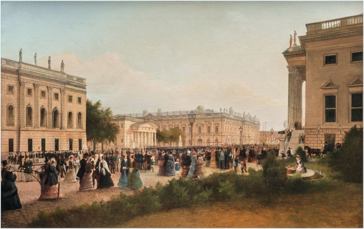 En anden metropol, som var vigtig at besøge, var Preussens vældige hovedstad Berlin. Mon ikke mange kan nikke genkendende til dette maleri af Operapladsen i Berlin. Midt i billedet ses ’Neue Wache’, der fortsat er en markant bygning i Berlin. Til højre for ’Neue Wache’ ses det daværende tøjhus. I dag er det et markant museum for tysk historie. Illustration fra bogen