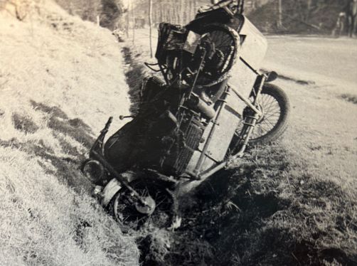 En brændt motorcykel med sidevogn, som blev kørt i grøften ved Bjergskov for at slippe ud af tysk beskydning langs hovedvejen. Foto: Th. Christensen i FHM