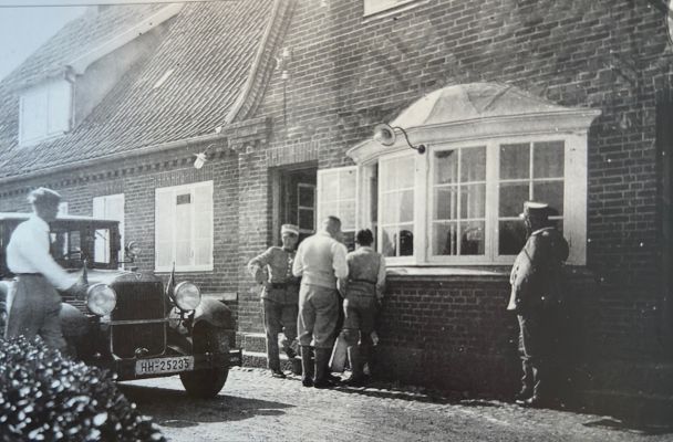 Grænsegendarmer og trafikanter ved grænsestationen i Sæd i 1931. Her blev grænsen overskredet 9. april 1940 kl. 4.10. Foto: Landshistorisk arkiv Gl. Tønder kommune.