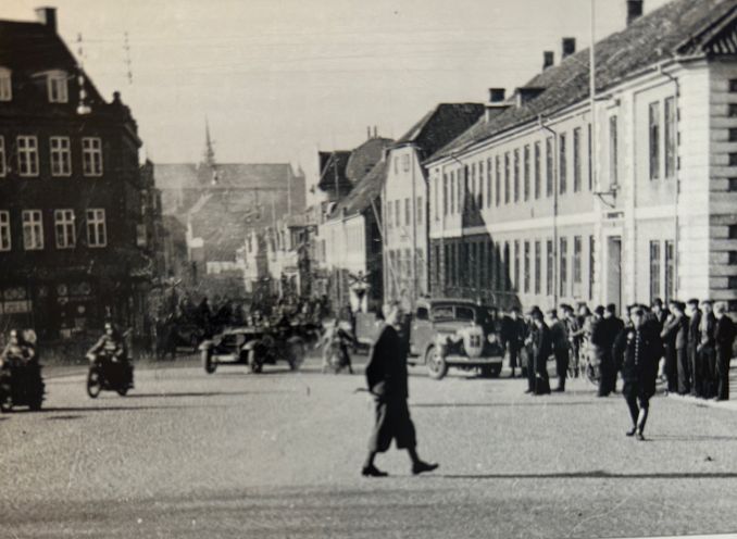 Politiassistent A.N. Jensen standsede ifølge sin egen rapport skydningen ved kasernen i Haderslev ved at hæfte et hvidt håndklæde på en stok og gå ud på gaden og vifte med det. Billedet er taget kort efter. Foto: MSJ Mediearkiv.