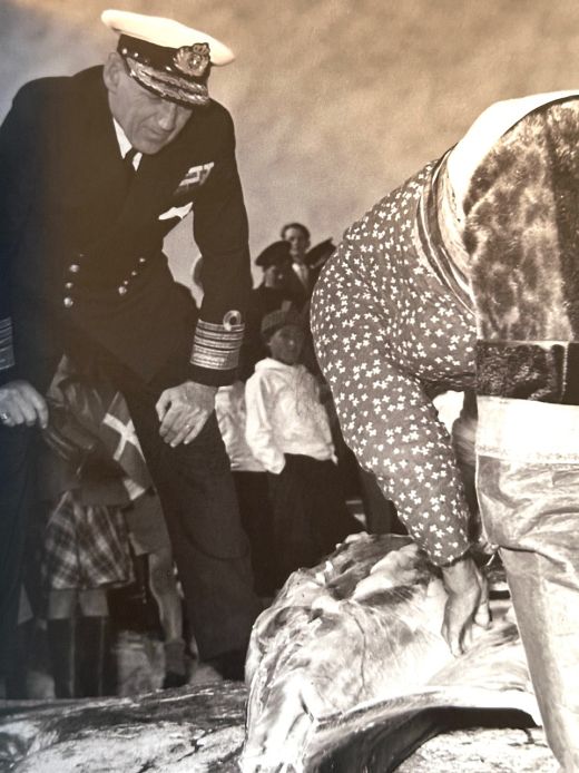 Frederik 9. og dronning Ingrid får demonstreret, hvordan et marsvin flænses. En fanger havde også fanget en sildepisker, så bygden og de kongelige blev budt på delikatesser