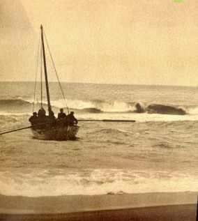 Havbåd i 1910 på vej ind gennem brændingen med nattens fangst.
