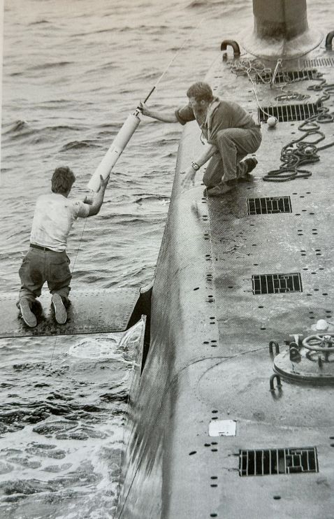 Ubåden “Spækhuggeren” opsamler en sovjetisk sonarbøje i Østersøen i 1974. En del af Den Kolde Krigs hverdag var at søge at indsamle genstande, fotografere og indhente elektroniske efterretninger om Warszawapagtens våbenudvikling. (Foto: Forsvarsgalleriet.)