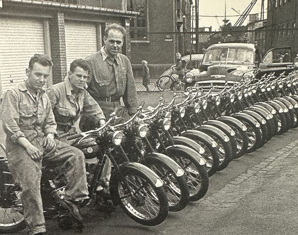 Tre DISA medarbejdere med nye motorcykler i Frihavnen i 1954. (Foto: DISA)