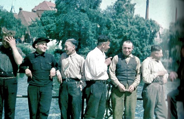 Syv sovjetiske krigsfanger fra “Rosenhaven” nyder solen ved Munke Mose