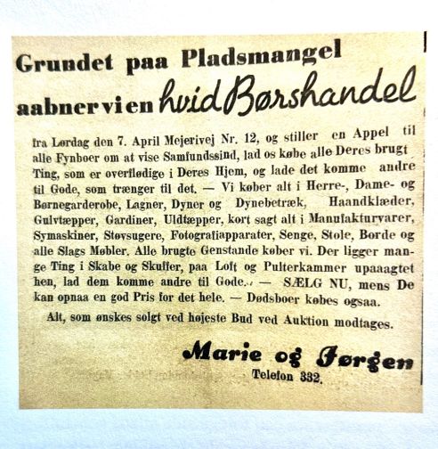 “Grundet pladsmangel åbner vi en hvid børshandel” - Et udklip fra Bogense Avis 5. april 1945. Hvid børshandel var datidens genbrugsbutik