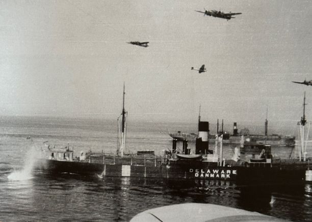 9. april 1940 var begyndelsen på en hård tid for den danske handelsflåde. Her er det S/S Delaware, der blev ramt af to bomber fra RAF i Nordsøen. Skibe, der var på vej til eller fra Tyskland, var strategiske mål. Det er Blenheim-bombefly, der ses over skibene