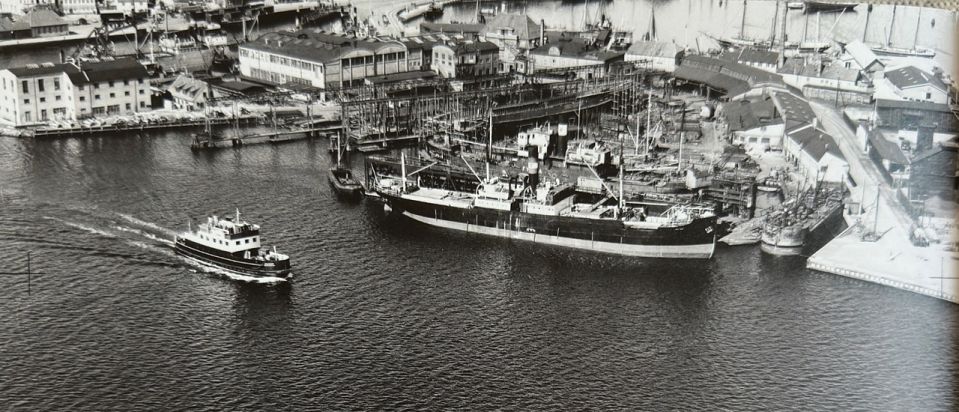 Foråret 1948. På bedding står ELLEN NIELSEN, som blev søsat 15. juli 1948. Søsterskibet HUGO NIELSEN er endnu ikke kommet længere end til opbygning af bunden. Til venstre ses det nye snedkerværksted fra 1945.