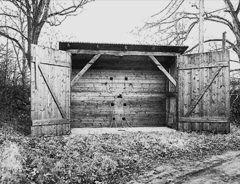 Henrettelsesskuret på 2. redan, Christiania. De seks steder, hvor rebene, der skulle fastholde den dømte ses tydeligt. Hullet midt i er placeret, hvor hjertet på personen er. Sammenholdt med de skiver, personerne fik fæstnet på brystet, kan man notere, at betjentene havde ramt præcist. Foto HPN.