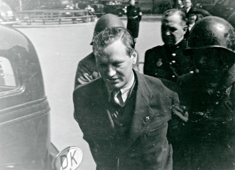Arno Hammeken føres til Maglegårdsskolen i Hellerup af både politi og frihedskæmpere. Billedet er taget umiddelbart efter befrielsen. Foto: FHM