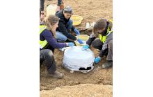Da der var tale om et helt særligt fund, fik vi den følgende mandag fundet bragt i sikkerhed og begyndte at kigge nærmere på det. Efter at være blevet renset let af vores konservator var det tydeligt, at mønten, som er på størrelse med en 20-krone, på bagsiden havde spor efter, at der har været påloddet en nål og derunder en lille øsken. Mønten har været båret på tøjet, og sådanne møntsmykker var populære i Danmark i tidsrummet 1050-1250. Ofte blev de båret som par. Imellem øskenerne kunne hænge en perlekæde.