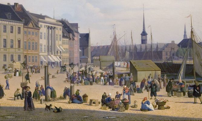 Sally Henriques har malet dette billede af folkelivet på Højbro Plads i København en sommerdag i 1844. Der ses to vandpumper. En kvinde er ved at pumpe vand op ved pumpen til venstre. Statens Museum for Kunst