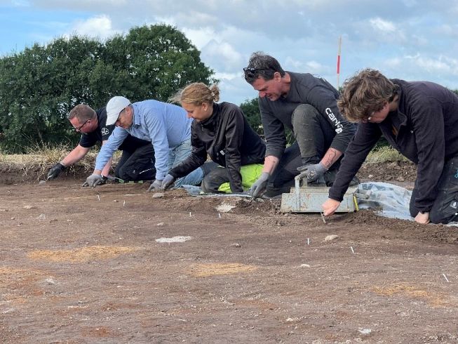 Afrensning af udgravningsfelt med hjælp af René og Michael fra Sønderjyllands Amatørarkæologer. Foto: Sønderjyllands Amatørarkæologer