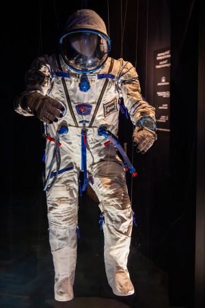 Andreas Mogensens rumdragt fra missionen i 2015. Rumdragten kan ses i udstillingen Ukendt Land. Foto Nationalmuseet