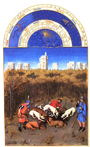 Årets sidste måned var ofte kendetegnet af arbejdet med svin. Her er vi uden for det slot, hvor hertugen blev født: Château de Vincennes. Svinene har gået på markerne og ædt sig fede i olden, så de er ofte hentet ind, hvor slagtningen er i fuld sving. Skovene, der hørte til slottet, var meget værdsatte af kongen, der gerne brugte dem til jagt. Her er en almindelig jagt overstået, og et vildsvin er blevet nedlagt. Hundene har kastet sig over det. De skal have deres belønning. Her er det blodhunde og en såkaldt ”svinehund”, der er i fuld sving.