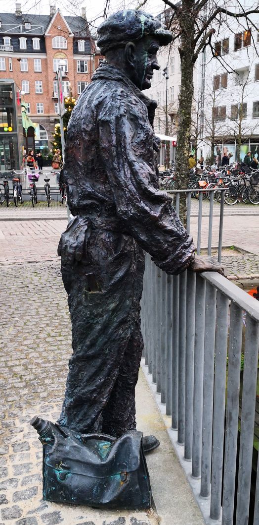 Termoflaske i tasken, figur af Jens Galschiøt på Børnehusbroen, opstillet sept. 2024, om.