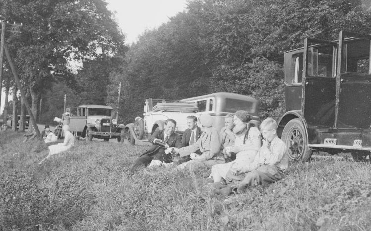 Kaffe i grøftekanten ved en større udflugt med biler i 1936, kbh.billeder.