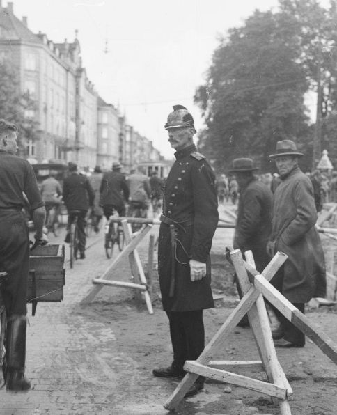 Politibetjent i uniform og med hjelm og politistav. Foto fra Østerbrogade 1930-ere, kbh.billeder