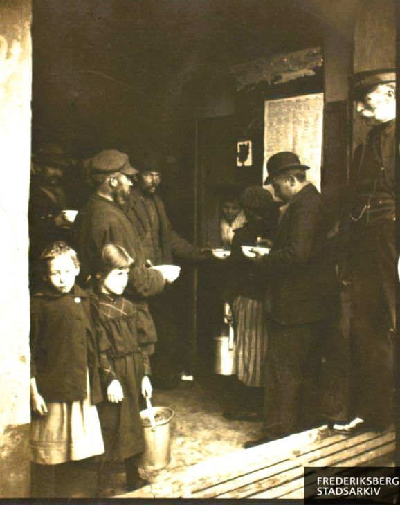 Uddeling af suppe fra suppekøkken på Vesterbro 1900. Fotografiet viser den nød og fattigdom som eksisterede langt væk fra de veldækkede spiseborde med terriner, Frederiksberg arkiv.