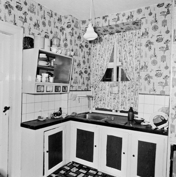 Foto 1963 af køkken i lejlighed i St. Paulsgade i København. I det velindrettede køkken med tapet ses en Raadvad maskine til højre på bordet, kbh.billeder.