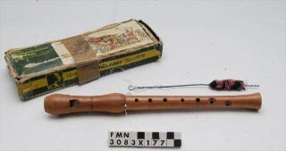 Kvindemuseet har en blokfløjte med original æske, rensebørste, spilleinstruktion og brugsanvisning.