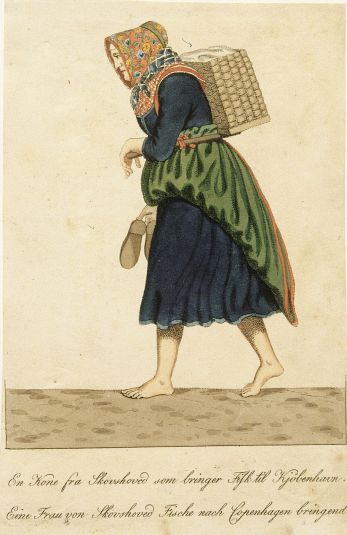 Skovserkone på vej til byen med fisk i en rygkurv. Hun går i bare fødder på landevejen, for at spare på skoene, som først kom på, når hun kom til staden. Nationalmuseet online.