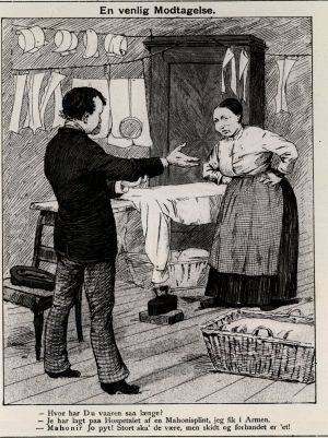 Strygescene fra det konservative magasin Punch 1885. Der bruges et trækulsstrygejern. Nationalmuseet