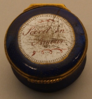 Fransk pudderdåse af porcelæn fra 1700-tallet. Den har bronzeindfatning og i låget et hvidt felt med teksten: ”Secret en Amour”. Dåsen har tilhørt en hustru til en storkøbmand i Roskilde, Roskilde Museum