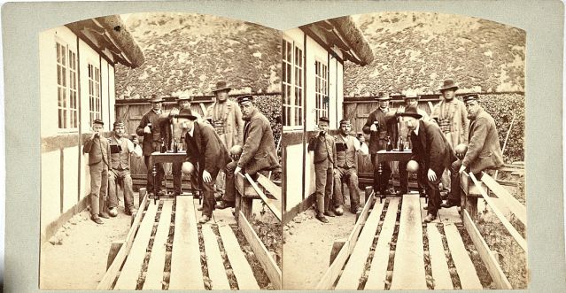 Keglespillere på en fynsk kro. Stereofotografi af Hans Chr. Brøns ca. 1875, Register over danske stereobilleder.