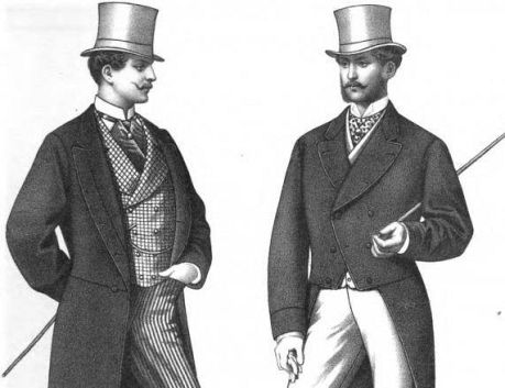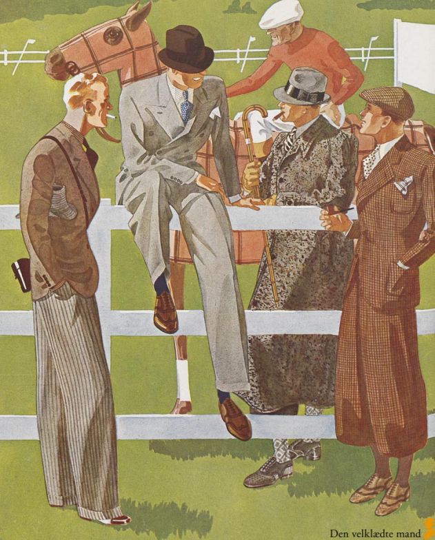 Herremoden 1935 præsenteret af Illum. Læg mærke til at alle bærer slips, undtagen jockeyen, den velklædte mand