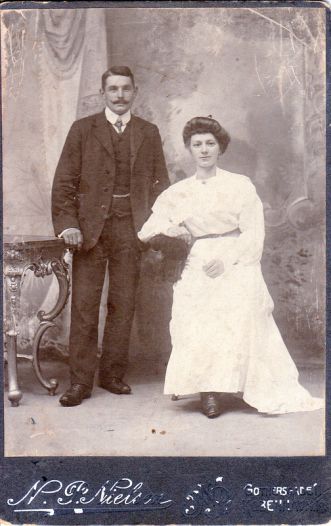 Brudepar fotograferet i Gothersgade i 1911. De var begge bornholmere og manden i jakkesæt, hvid skjorte med hvid flip var sømand og stenfisker. Bruden med moderne hvid brudekjole, fotohistorie